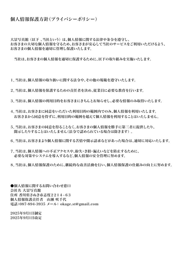 大景写真館では、お客様からお預かりする大切な個人情報を適切に管理し、安心してご利用いただける写真館であるために、法令を遵守し、情報保護の向上に日々取り組んでまいります。